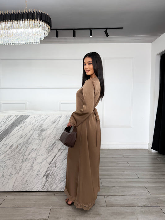 Elegant simplicity meets delicate detail in the Seraphine Satin Dress. Crafted from soft satin with a graceful drape, this full-length design features subtle lace detailing at the cuffs and hem, adding a refined feminine touch.